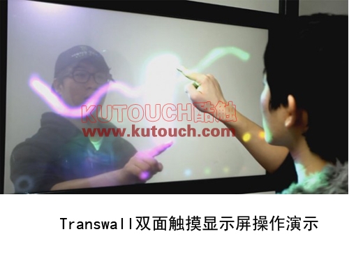 该款触控屏名为Transwall,屏体外形类似透明白板,由T形框架固定,边框上加入了红外触控传感器,用于检测来自用户的触控操作,传感器所检测到的信息随后会被发送到一部计算机当中,后者会对这些数据进行处理,并通过安装在框架上的投影仪将操作投射回屏幕,从而达到双面触控的使用效果。
